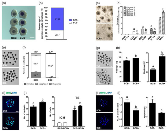 Comparison of brilliant cresyl blue (BCB-) and BCB+ cumulus-oocyte complexes (COCs) in terms of cumulus expansion, nuclear maturation, and subsequent embryo development after parthenogenetic activation. (a) Representative photomicrographs of germinal vesicle-stage porcine COCs after BCB staining. The colorless ooplasm indicates BCB- COCs, and the blue ooplasm indicates BCB+ COCs. (b) The ratio of BCB- to BCB+ COCs after staining. (c) Representative photomicrographs, and (d) the percentage of the degree of the cumulus expansion of BCB- and BCB+ COCs, after 44 h of IVM. (e) Representative photomicrograph of in vitro matured oocytes, and (f) the percentage of different stages of nuclear maturation in BCB- and BCB+ oocytes, after 44 h of IVM. The white arrows indicate in vitro matured oocytes with a first polar body. (g) Representative photomicrographs of blastocysts (white asterisks), and (h) the cleavage and blastocyst formation rates of embryos developed from BCB- and BCB+ oocytes. (i) Immunocytochemistry of CDX2/4′,6-diamidino-2-phenylindole (DAPI) using blastocysts developed from the indicated groups. Merged images of CDX2 (green) and DAPI (blue) signals are shown. (j) Quantification of the total, inner cell mass (ICM), and trophectoderm (TE) cell numbers in the indicated groups. (k) Terminal deoxynucleotidyl transferase mediated dUTP digoxygenin nick end labeling (TUNEL) assay using blastocysts developed from the indicated groups. Merged images (light green) of TUNEL (green, white arrowheads) and DAPI (blue) signals are shown. (l) Quantification of the numbers and proportion of apoptotic cells in the indicated groups. Within each category, groups marked with different letters (a and b) are significantly different (p < 0.05). Bar = 100 μM.
