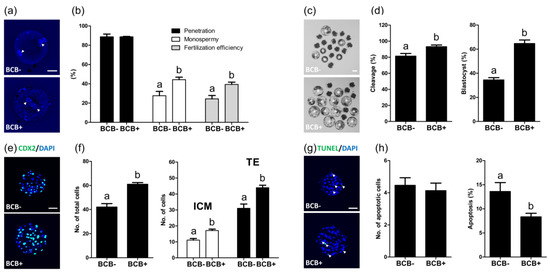 The subsequent development of in vitro fertilized embryos developed from BCB- and BCB+ porcine oocytes. (a) Representative photomicrographs of pronuclear stage zygotes developed from BCB- and BCB+ oocytes. (b) The penetration rate (percentage of penetrated oocytes/total inseminated oocytes), monospermy rate (percentage of oocytes containing only one male pronucleus/total oocytes penetrated), and fertilization efficiency (percentage of monospermic oocytes/total oocytes inseminated) of the zygotes developed from BCB- and BCB+ oocytes. (c) Representative photomicrographs of blastocysts (white asterisks), and (d) the cleavage and blastocyst formation rates of embryos developed from BCB- and BCB+ oocytes. (e) Immunocytochemistry of CDX2/4′,6-diamidino-2-phenylindole (DAPI) using blastocysts developed from the indicated groups. Merged images of CDX2 (green) and DAPI (blue) signals are shown. (f) Quantification of the total, inner cell mass (ICM), and trophectoderm (TE) cell numbers in the indicated groups. (g) Terminal deoxynucleotidyl transferase mediated dUTP digoxygenin nick end labeling (TUNEL) assay using blastocysts developed from the indicated groups. Merged images (light green) of TUNEL (green, white arrowheads) and DAPI (blue) signals are shown. (h) Quantification of numbers and proportion of apoptotic cells in the indicated groups. Within each category, groups marked with different letters are significantly different (p < 0.05). Bar = 100 μM.