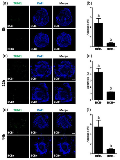 Detection of cellular apoptosis during the in vitro maturation of BCB- and BCB+ porcine cumulus-oocyte complexes (COCs), as detected by TUNEL staining. Representative TUNEL (green) assay images of COCs and quantification of TUNEL positive cells in BCB- and BCB+ COCs, after 0 h (a,b), 22 h (c,d), and 44 h (e,f) of in vitro maturation. Within each category, groups marked with different letters are significantly different (p < 0.05). Bar = 100 μM.