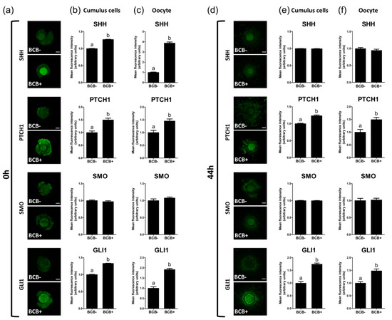 Immunocytochemical analysis of Sonic hedgehog (SHH)-signaling proteins in BCB- and BCB+ porcine cumulus-oocyte complexes (COCs). Representative images of porcine COCs of each group stained with antibodies directed against SHH, PTCH1, SMO, and GLI1 and comparison of expression in cumulus cells and oocytes after 0 h (a–c) and 44 h (d–f) of in vitro maturation, respectively. Within each category, groups marked with different letters are significantly different (p < 0.05). Bar = 100 μM.