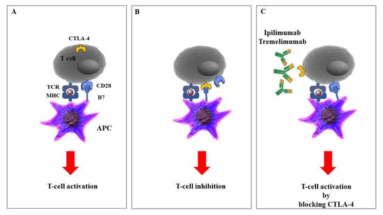 The role of cytotoxic T-lymphocyte-associated protein 4 (CTLA-4) inhibitors in the activation of T cells. A: Antigen-presenting cells (APCs), including dendritic cells (DCs), macrophages, natural killer (NK) cells, and B cells, process tumor antigens and present them to specific T cells, leading to activation of the T cells and immune responses to the tumor. B: Upon T cell receptor activation, CTLA-4 is expressed on the T cell surface and interacts with the co-receptor CD28 that is expressed on APCs, leading to the end of the T cell responses. C: Anti-CTLA-4—specific monoclonal antibodies prevent the interaction between CTLA-4 and CD28 and contribute to inhibitory signals in T cells. The figure was produced using Servier Medical Art (http://smart.servier.com/).