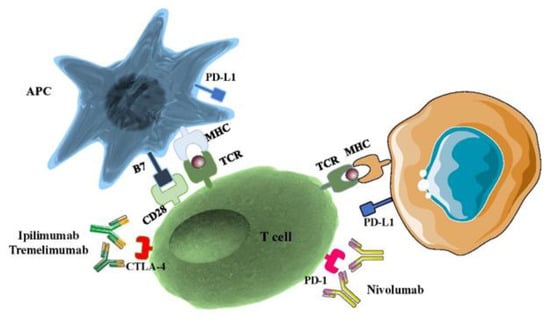 CTLA-4 was recognized by Brunet et al. from mouse T cell-derived cDNA libraries [26]. CTLA-4 is the earliest known immune checkpoint and in vivo experiments showed that mice died after 3–4 weeks CTLA-4 deletion for immunosuppression, showing its important roles in immune responses and T cell activation [27]. Activated T cells and Foxp3+ T-reg cells led to CTLA-4 upregulation, with a key role in self-tolerance and maintaining homeostasis. CTLA-4 is a CD28 homolog and with high affinity binding to B7-1/2. CTLA-4 has a barrier function to prevent T cell activation and proliferation [28]. Numerous investigations provided data that CTLA-4 is linked to autoimmune diseases such as Graves’ disease, type 1 diabetes, thyroiditis, and lupus erythematosus. More recently, CTLA-4 blockade has been demonstrated to be a curative strategy for cancer therapy through the challenge with the CD28-B7 combination to exhibit an inhibitory effect on signaling molecules in a variety of cancer diseases [29]. Tremelimumab is another CTLA-4 inhibitor [30]. Tremelimumab is a fully human IgG2 isotype monoclonal antibody used against CTLA-4 and is under investigation as a treatment for several cancers, including melanoma, mesothelioma, and NSCLC [31,32,33]. Recently, monoclonal antibodies against CTLA-4, ipilimumab, and tremelimumab, alone or in combination with PD-1/L-1 inhibitors, significantly increased antitumor effects and improved the survival of several malignancies (Figure 1).