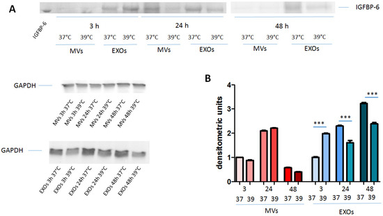 Western blotting analysis to detect IGFBP-6 was performed on MV and EXO preparations. MVs and EXOs presented a band specific for IGFBP-6 (25 kDa) that presented variations in intensity according to time (Figure 1A). The densitometric analysis shows that, after normalization to GAPDH (37 kDa), MVs presented a peak of IGFBP-6 protein at 24 h (Figure 1B; p < 0.0001, both 3 h and 48 h vs. 24 h), without differences between 37 °C and 39 °C at different time points. Conversely, IGFBP-6 found in EXOs increased steadily at 37 °C from 3 to 48 h (p < 0.001, 24 h and 48 h vs. 3 h). At 39 °C, there was also an increase but only at 48 h as compared to 3 h and 24 h. Interestingly, IGFBP-6 protein was significantly higher at 39 °C than at 37 °C after 3 h of incubation (p < 0.0001), but was significantly lower at 39 °C than at 37 °C both at 24 h and 48 h (both p < 0.0001). Overall, these results show that IGFBP-6 is present in EVs secreted from Mo-DCs and that hyperthermia can modulate its content only in EXOs.
