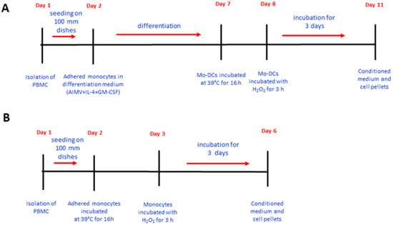 Flow diagram of the experiment. (A) Mo-DCs were obtained upon incubation of monocytes with serum-free medium (AIMV) in the presence of IL-4 and GM-CSF starting on Day 2. On Day 7, Mo-DCs were incubated at 39 °C for 16 h, while other dishes were incubated with H2O2 for 3 h on Day 8. An incubation of 3 days started for all dishes on Day 8 and ended on Day 11. (B) The same protocol was used for monocytes, except that they were exposed to hyperthermia on the day after they were plated (Day 2) or incubated with H2O2 on Day 3. The incubation of all dishes at 37 °C started on Day 3 and finished on Day 6.