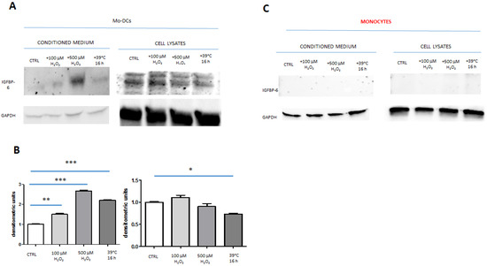 To examine whether IGFBP-6 could be found free in the conditioned medium upon hyperthermia, we applied a protocol by which not were only Mo-DCs incubated at 39 °C for 88 h (16 h at 39 °C and 72 h at 37 °C) (Figure 2A) but also the conditioned medium was concentrated 100×. In parallel, Mo-DCs were incubated with H2O2 for overall 75 h (3 h with the stimulus and 72 h without) (Figure 2A). H2O2 has already been shown to induce IGBP-6 secretion in a dose-dependent manner [12]. Monocytes were treated in the same manner as Mo-DCs (Figure 2B).