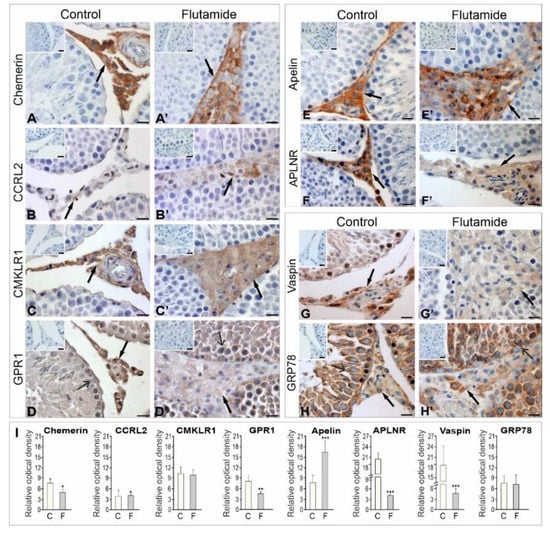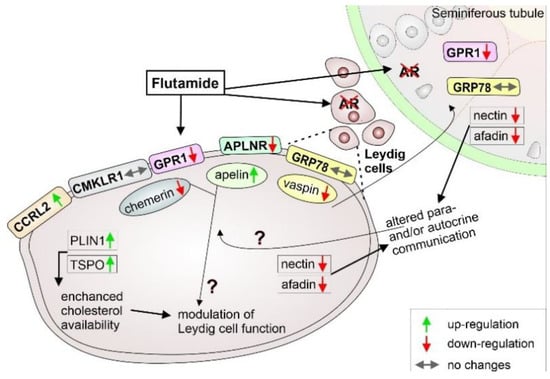 Brzoskwinia, M.; Pardyak, L.; Rak, A.; Kaminska, A.; Hejmej, A.; Marek, S.; Kotula-Balak, M.; Bilinska, B. Flutamide Alters the Expression of Chemerin, Apelin, and Vaspin and Their Respective Receptors in the Testes of Adult Rats. Int. J. Mol. Sci. 2020, 21, 4439. https://doi.org/10.3390/ijms21124439