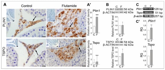 2.5. Expression of PLIN1 and TSPO Genes in Rat Testes, Effect of Flutamide