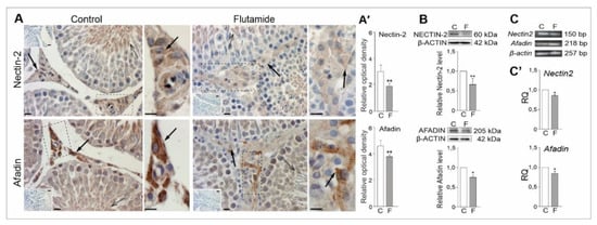 2.6. Expression of Nectin2 and Afadin Genes in Rat Testes, Effect of Flutamide