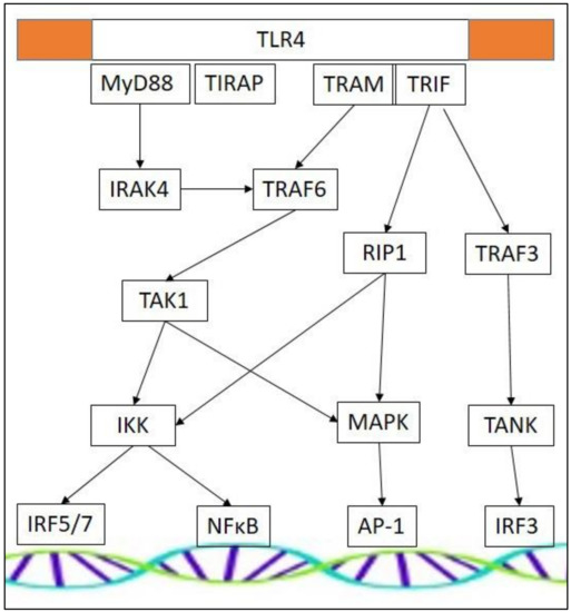 TLRs are composed of three distinct domains: An extracellular domain that senses ligand, a transmembrane domain anchor, and an intracellular domain that translates activation into an appropriate cellular response. The cytoplasmic portion of TLRs shows high similarity to that of the IL-1 receptor family, and is therefore termed the Toll/IL-1 receptor (TIR) domain. Downstream cellular effects are generated through an association with various cytoplasmic adaptor proteins and the downstream signaling they can provoke. Myeloid differentiation primary response 88 (MyD88), TIR domain-containing adapter inducing interferon (TRIF), TRIF-related adapter molecule (TRAM), and TIR domain-containing adapter protein (TIRAP) mediate appropriate intracellular signaling cascades, activating differential sets of transcription factors. The different receptors use a specific combination of adaptor proteins, determining the resultant downstream signaling. TLR4 appears most versatile, as it can activate all four different downstream adaptors (Figure 1) [67]. TLR3 does not use the MyD88 dependent pathway, and is activated by TRIF-dependent signaling pathways only. TLR signaling cascades are complex and interconnected [68], and different adaptor molecules may result in a similar end-product. IFNα-production by plasmacytoid dendritic cells can be initiated by activation of TLR7 and TLR9, a process that is MyD88-dependent [69,70]. In contrast, stimulation of type 1 IFN-inducible genes initiated through TLR3 and TLR4 stimulation is MyD88-independent and involves TRIF-dependent pathways [69,70,71]. TLR cascades may involve IFN regulatory factors (IRFs), which regulate innate immunity via expression of type 1 IFNs and IFN-inducible genes. In addition, NFκB can be activated, which induces pro-inflammatory cytokine and chemokine gene expression. Another downstream effector is activator protein-1 (AP-1), which is involved in the regulation of the cell cycle, and in cell differentiation and survival [72].