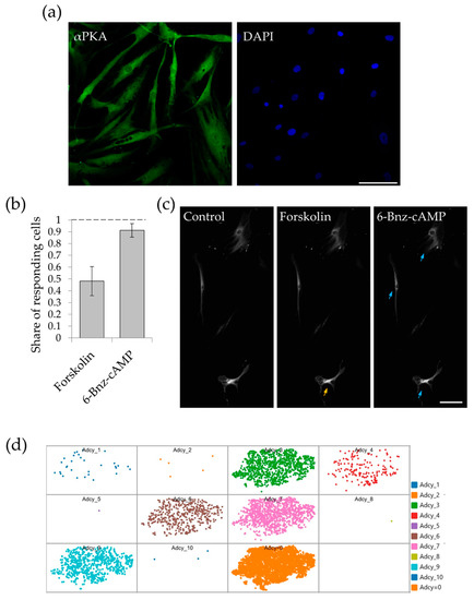 Multipotent stromal cells (MSC) response to adenylate cyclase and protein kinase A (PKA) activation. (a) Immunofluorescent staining of the catalytic subunit of protein kinase A in MSC. Scale bar 100 µm. (b) Share of the cells responding to adenylate cyclase activator forskolin (10−6 M) and cell-permeable direct activator of protein kinase A 6-Bnz-cyclic AMP (10−4 M). Results are presented as mean ± SE, n = 17–24 in 4 independent experiments on the material of 3 different donors. (c) Representative field of view of the cells responding to the sequential adding of forskolin and 6-Bnz-cAMP. Yellow arrow marks the cell responded to the forskolin added. Blue arrows show the cells responded to 6-Bnz-cAMP added. Scale bar 100 µm. (d) Expression of mRNA of different isoforms of adenylyl cyclase in human MSC population. Raw data of scRNAseq analysis of MSC were downloaded from Reference [19].