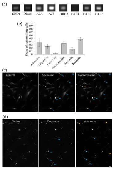Next, we explored PKA activation by the most prominent hormonal MSC activators, including adenosine, dopamine, histamine, noradrenaline, and serotonin, which may activate Gs-associated isoforms of receptors to these hormones. Expression of Gs-associated receptors in MSCs was tested using PCR-analysis. Figure 2a, as well as Supplementary Figure S1, shows that MSCs express mRNA of adenosine receptors (A2A and A2B), dopamine receptors (DRD1 and DRD5), histamine receptors (HRH2), and serotonin receptors (HTR6, and HTR7). Among the analyzed receptors, we detected all tested isoforms, with the exception of HTR4 isoform of the serotonin receptor. The expression of all three isoforms of β-adrenoceptors in MSC we recently reported elsewhere [12].
