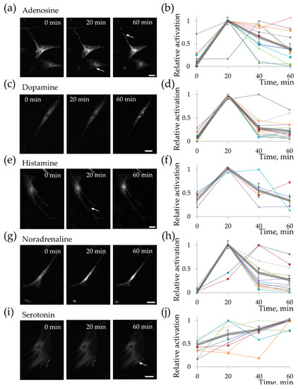 More detailed examination of cAMP-mediated responses of MSC showed some patterns in cellular responses to individual hormones. Adenosine, dopamine, and noradrenaline induced strong and transitory responses, whereas histamine and serotonin activated long but weak cAMP-dependent responses (see Figure 3 and Supplementary Figures S2–S6). Interestingly, some particular cells activated PKA for a long time even in response to adenosine, noradrenaline, and, in one case, dopamine (see Figure 3b,d,h, respectively). Graphs on Supplementary Figures S2–S6 (section (b) in all figures) show the results presented in a different fashion, where it is possible to compare signal amplitudes. It is clear that long responses predominantly have much lower amplitude compared to transitory signals. Thus, MSCs respond to adenosine, dopamine, histamine, noradrenaline, and serotonin, but the amplitude and temporal dynamics of the signal vary between different hormones, as well as between the responses of different cells to a particular hormone.