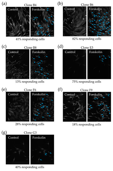 Responses on the forskolin adding to single cell-derived clones of MSC expressing PKA-Spark. Blue arrows mark responding cells. Scale bar 100 µm. (a–g) representative images of responses of 7 distinct MSC clones. The ratio of responding cells indicated on each panel.