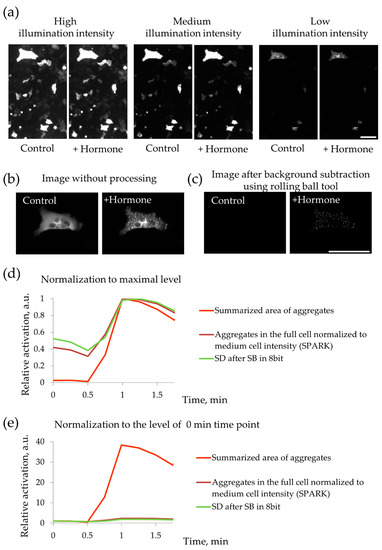 Testing the method of registration of PKA activity using PKA-Spark fluorescent probe. (a) PKA-Spark was expressed in HeLa-Kyoto cells with different expression levels and the cells were stimulated with serotonin (10−5 M). Fluorescence of the same field of view was registered with different illumination intensity (marked above the pictures). It is seen that only the most bright cells expressing the probe with relatively high level, demonstrated hormone-dependent response. Scale bar 100 µm. (b,c). Processing of fluorescent images of responding cells. (b) Responding cell before and after hormone adding without image processing. (c) Fluorescent figures after background subtraction using rolling-ball tool. Scale bar 100 µm. (d,e) Test of different strategies of quantification PKA-Spark fluorescent droplets formation. (d) The results of quantitative analysis were normalized to the maximum measured level. (e) The results of quantitative analysis were normalized to the zero time point.