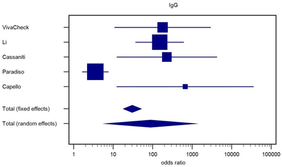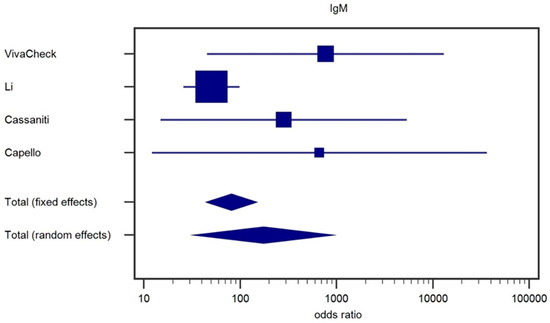 In addition, for the IgM (Figure 2) odds ratio, we found significant fixed and random effects (p < 0.001 in both cases); heterogeneity was less high than IgG; for Cochran’s Q we got 6.09 (p = 0.1072), thus a not significant heterogeneity, even keeping p < 0.1, as significance cutoff as suggested by Higgins et al., given the low number of studies [32] and the I2 statistic was found 50.8% (CI95%: From 0.0% to 83.7%). Furthermore, for IgM we performed a second meta-analysis (data not shown) using all the pooled Cassaniti IgM data: For fixed and random effects we found again p < 0.001, with a Cochran’s Q = 5.02 (p = 0.1702), and the I2 statistic was 40.3% (CI95%: From 0.0% to 79.8).