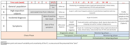 The timeline representing the different phases of the diseases. The interpretation of the results of the rapid tests depends on where the patients are in the timeline. The different groups are classified according to anamnestic criteria. The inception point varies fittingly. Each group represents different settings, where the rapid test can be used for different purposes: (A) Screening of a whole population for epidemiological reasons; (B) screening of a high-risk population; (C) screening in close contacts for diagnosis, follow-up and case tracking; (D) diagnosis and follow-up in symptomatic patients. In all case scenarios, the rapid test can provide information related to the possible acquired immunity to coronavirus. Finally, people and patients in each group should be divided according to the different outcomes shown in Table 4.