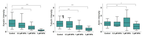 Normalised intensity of CSK filaments changes with increasing treatment of Withaferin-A (WFA) (n = 280). Box plots range from 25% to 75% with bars at 5% and 95%. Asterisks indicate a statistical difference (* p < 0.05, ** p < 0.01, *** p < 0.001, obtained using Dunnett’s test against control cells).