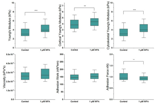 Withaferin-A stiffens HEK cells, specifically their cytoskeleton (n = 143). Box plots range from 25% to 75% with bars at 5% and 95%. Asterisks indicate a statistical difference (* p < 0.05, ** p < 0.01, *** p < 0.001, obtained using Student’s t-test).