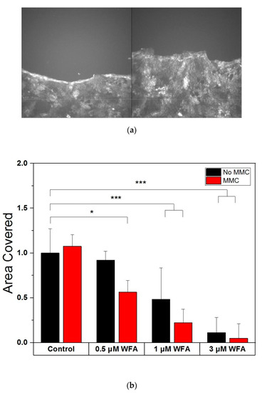 To verify that the decrease in sheet colonisation was a consequence primarily of WFA-impeded cell motility rather than reduced cell division, we carried out further experiments inhibiting cell division via incubation with 4 µg/mL Mitomycin-C (MMC) for 3 h before also being treated with WFA as above (Figure 4). Interestingly, there was no difference in the area reclaimed by cells with or without MMC treatment when no WFA was present, indicating that cell division was not a necessary driver of wound healing over 24 h. However, for all WFA dosages used, MMC-treated cell sheets showed reduced area recovery compared to their non MMC-treated counterparts (p = 0.0107). Cell sheets may compensate for the WFA caused loss of migration by relying on cell division for wound healing, which is why MMC treatment has an effect in this case. The lower migration of WFA-treated cells in the presence of MMC implies that WFA mainly targets migration, and not cell division, as if it had blocked division, the addition of MMC would have had no effect. Overall, the results show that WFA inhibits wound healing, specifically through targeting cell migration.