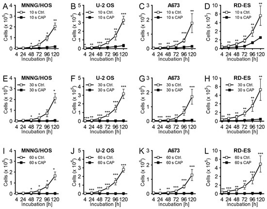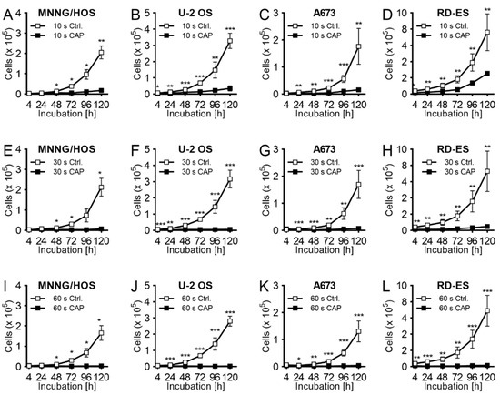 Growth inhibition effect of cold atmospheric plasma (CAP) exposure. The human OS cell lines MNNG/HOS (A,E,I) and U-2 OS (B,F,J) and ES cell lines A673 (C,G,K) and RD-ES (D,H,L) were treated for 10 s (A–D), 30 s (E–H), or 60 s (I–L) with CAP with kINPen MED. As a control group the same cell lines were treated only with carrier gas argon (CAP swiched off). The treated cells were cultivated over 120 h. The number of viable cells was counted at 4, 24, 48, 72, 96, and 120 h after exposure by using CASY cell counter and analyzer. Data show mean ± SD; Means were tested for significant differences with a paired t-test and indicated as followed: * p ≤ 0.05, ** p ≤ 0.01, *** p ≤ 0.001.