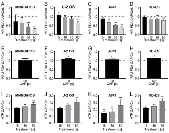 CAP treatment affects the integrity of the cell membrane. Fluorescein diacetate (FDA) uptake assay (A–D): the cell lines MNNG/HOS (A), U-2 OS (B), A673 (C), and RD-ES (D) were treated with 5, 10, 30, or 60 s of CAP or carrier gas argon, and stained with FDA-and ethidium bromide (EtBr). Afterward, the flow cytometric analysis of the viable cell was performed. For each cell line, the MFI of CAP treated cells was normalized to the MFI of argon treated cells. FDA-release assay (E–H): the cell lines MNNG/HOS (E), U-2 OS (F), A673 (G), and RD-ES (H) were incubated with FDA, washed, and treated with 60 s of CAP or carrier gas argon. After an incubation time of 20 min, the cell-free supernatant was analyzed in a fluorescence plate reader. For each cell line, the RFU of the supernatant of CAP-treated cells was normalized to the RFU of the supernatant of argon gas-treated cells. ATP-release assay (I–L): MNNG/HOS (I), U-2 OS (J), A673 (K), and RD-ES (L) were treated for 15, 30, or 60 s with CAP or carrier gas argon. After an incubation period of 3 min, the relative ATP concentrations of the cell-free supernatants were measured. The data for CAP treatment were normalized to that of the respective controls. Data show mean ± SD; significant differences were examined using a paired t-test: * p ≤ 0.05, ** p ≤ 0.01, *** p ≤ 0.001. MFI: mean fluorescence intensity, RFU: relative fluorescence units.