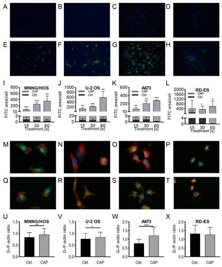 CAP treatment modulated the cytoskeleton and membrane integrity. Dextran-uptake assay (A–L): control-treated cells (A–D) and CAP-treated cells (E–H), MNNG/HOS (A,E,I), U-2 OS (B,F,J), A673 (C,G,K), and RD-ES (D,H,L) cells were seeded on cover slides and allowed to attach for 24 h. After incubation, cells were treated with 15, 30, or 60 s of CAP or carrier gas argon. Fluorescence microscopy was used to analyze of FITC dextran and DAPI. The FITC-positive areas were measured and normalized to the count of DAPI labeled cell cores. G-F-actin assay (M–X): MNNG/HOS (M,Q,U), U-2 OS (N,R,V), A673 (O,S,W), and RD-ES (P,T,X) cells were seeded on cover slides and allowed to attach for 24 h. After incubation, the cells were treated with 5 s (A673, RD-ES) or 10 s (MNNG/HOS, U-2 OS) of CAP or carrier gas argon. Cells were labeled with TRITC conjugated Phalloidin and Alexa Fluor 488 conjugated Deoxyribonuclease I, and analyzed using fluorescence microscopy. The ratio of the red (TRITC) to green (Deoxyribonuclease I) signal cell was calculated for each. Data show mean ± SD; significant differences were indicated according to a paired t-test as followed: * p ≤ 0.05, ** p ≤ 0.01, *** p ≤ 0.001.