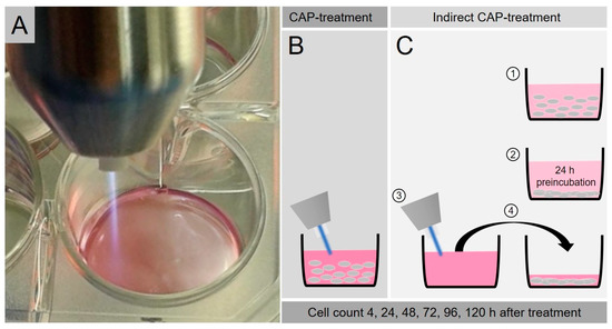 The principles of direct and indirect CAP treatment are shown schematically in Figure 7B,C. In the case of direct CAP treatment, the cells are suspended in the medium and directly exposed to CAP exposure there (Figure 7B). In the indirect CAP treatment (Figure 7C), on the other hand, the cells are not exposed to the CAP, but rather cultivated with CAP-activated medium (see Section 4.3 and Section 4.4. of the proliferation assays).