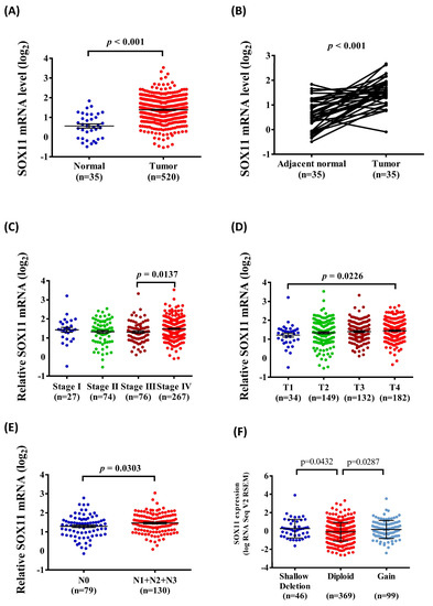 Association of SOX11 mRNA level and clinical status from the TCGA database. (A) The SOX11 mRNA level of HNSCC tissues were compared to normal tissues. (B) The SOX11 mRNA level were compared according to adjacent normal tissues and HNSCC tissues. (C) The SOX11 mRNA levels were compared according to tumor stage. (D) The SOX11 mRNA levels were compared according to tumor clinical T stage. (E) The SOX11 mRNA levels were compared according to clinical n stage. (F) Boxplots of RNA-Seq for SOX11 mRNA demonstrating significantly altered expression in diploid versus deletion and gain cancers.