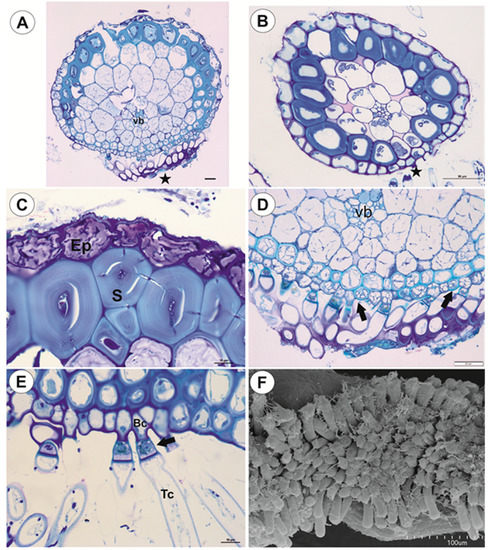 Running stolons have a similar structure to anchor stolons (Figure 6A–C). However, the difference occurs in the sclerenchyma development. There are only a few sclerenchyma cells on the dorsal side (Figure 6A) or only on the ventral side (Figure 6B). Epidermal adhesive trichomes occur along the ventral side (Figure 6A,B). In thicker stolons, xylem is better developed than in thinner ones, and up to seven vessels may occur (Figure 6C).