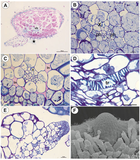 Anatomy of anchor stolons of U. neottioides. (A) Transversal section of anchor stolon, PAS reaction, vascular bundle (vb), adhesive trichomes (star), bar 100 µm. (B–D) vascular bundle structure: xylem (x), phloem (ph), intercellular spaces (in), tracheary element–vessel (tr), sieve tube (S), all bars 10 µm. (E,F) Formation of new stolon on the ventral-lateral side of the stolon, bar 10 µm (E) and 50 µm (F).