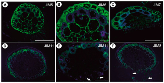 Pectin (JIM5, JIM7), extensin (JIM11) and arabinogalactan protein (JIM8) detection in anchor stolons of U. neottioides. (A,B) Presence of the JIM5, bar 100 µm (A) and 20 µm (B). (C) Presence of the JIM7, bar 100 µm. (D,E) Presence of the extensin; note positive signal in cell walls of barrier cells of trichomes (arrows), both bars 100 µm. (F) Presence of the JIM8; note positive signal in trichomes (arrows), bar 100 µm.