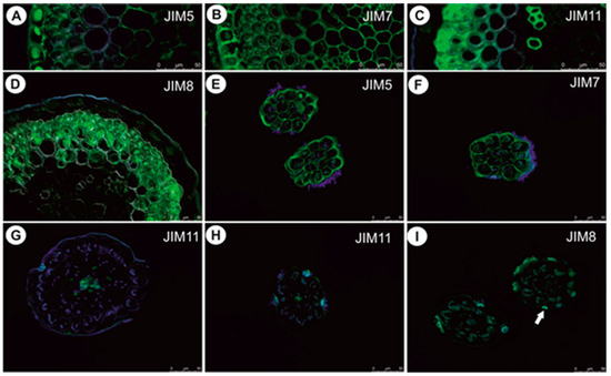 In anchor stolons, the pectic epitope recognized by the JIM5 and JIM7 antibodies are abundant in primary cell walls of various cell types: epidermis, parenchyma, phloem (Figure 8A–C). They are present in the intercellular matrices (primary cell walls) between sclerenchyma fibers and absent from the fiber secondary cell walls (Figure 8B). The JIM5 epitope is detected in the interior of fiber cells (Figure 8B). Both JIM5 and JIM7 epitopes also occur in vacuolar material in epidermal cells (Figure 8A–C). Extensin epitope (JIM11) is in the intercellular matrices (primary cell walls) between sclerenchyma fibers and the fiber secondary cell walls and is also detected in cell walls of vessels (Figure 8D,E). It occurs in cell walls of barrier cells of trichomes (Figure 8E). AGPs recognized by JIM8 are detected inside sclerenchyma fiber cells and inside trichome cells (Figure 8F). In the basal portion of inflorescence stalks, the occurrence of pectic epitopes recognized by the JIM5 (Figure 9A) and JIM7 antibodies (Figure 9B), the extensin epitope (JIM11) (Figure 9C) and the arabinogalactan protein (AGP, JIM8) (Figure 9D) is similar to that in anchor stolons. In filamentous leaf-like shoots, pectic epitopes recognized by the JIM7 and JIM5 antibodies are abundant in the primary cell walls of various cell types (Figure 9E,F). The extensin epitope (JIM11) is abundantly present in intercellular spaces of parenchyma cells, which surround the vascular bundle, and also in cells of the vascular bundle (Figure 9G,H). The AGPs recognized by the JIM8 are detected in barrier cells of trichomes and in algae which grow on the organ surface (Figure 9I).