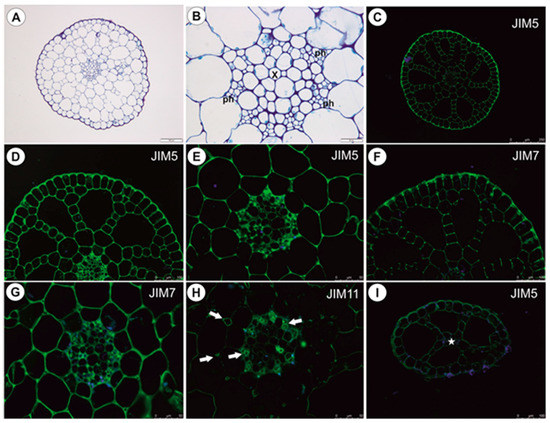 The small pith is surrounded by a large aerenchymatic cortex and an epidermis (Figure 10A); the pith (cylinder) is ectophloic. The vessel is located almost centrally and is surrounded by large parenchyma cells with thick cell walls (Figure 10B). The pectic epitope recognized by the JIM5 antibody is abundantly present in the walls of various cell types (Figure 10C–E) and the occurrence of pectic epitope recognized by the JIM7 antibody is similar to that by the JIM5. A closer inspection of the pith revealed that a larger amount of this epitope was found in thick cell walls of parenchyma cells (Figure 10G) in comparison to the JIM5 (Figure 10E). The extensin epitope (JIM11) is abundantly present in intercellular spaces of parenchyma cells and in phloem cells (Figure 10H).