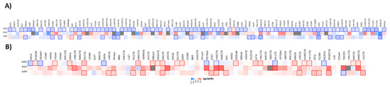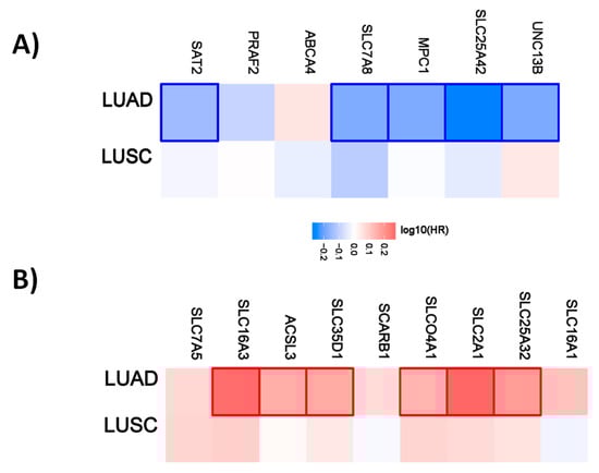 Hazard ratio of organic anion transporter expression in different lung cancer subtypes. The hazard ratio (HR) was calculated for (A) the favorable and (B) unfavorable list of genes in liver cancer for lung adenocarcinoma (LUAD) and lung squamous cell carcinoma (LUSC). The red and blue colors denote higher and lower risk, respectively. The rectangles with frames represent the statistically significant HR (p < 0.05).