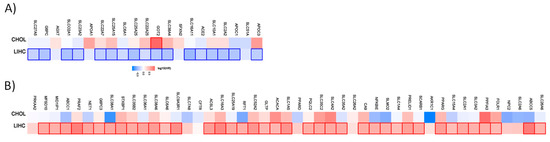 Hazard ratio of the organic anion transporter expression in different liver cancer subtypes. The hazard ratio (HR) was calculated for (A) the favorable and (B) unfavorable list of genes in liver cancer for cholangiocarcinoma (CHOL) and liver hepatocellular carcinoma (LIHC). The red and blue color denote higher and lower risk, respectively. The rectangles with frames represent the statistically significant HR (p < 0.05).