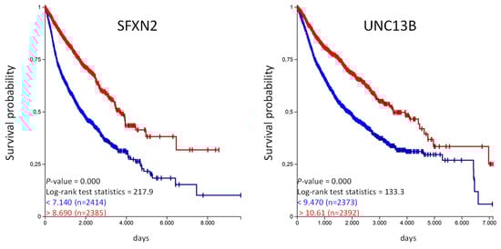 With our approach we have identified organic anion transporters and organic cation transporters that are prognostic for a given tumor entity. We were also able to identify genes that are prognostic in several tumor entities. The highest numbers of genes were identified for the organic anion transporter. UNC13B is favorable in five and SFXN2 in four tumor entities, implicating that these genes might have a general prognostic value. We have used the UCSC Xena platform to analyze if these genes have an prognostic value in the TCGA-PANCAN cohort with more than 12,800 samples derived from 17 different tumor entities [14]. We generated Kaplan–Meier plots and calculated overall survival probability for SFXN2 and UNC13B (Figure 5).