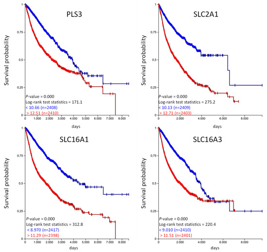 High PLS3, SLC2A1, SLC16A1, and SLC16A3 expression is associated with shorter overall survival in the TCGA-PANCAN cohort. The TCGA-PANCAN cohort was queried for PLS3, SLC2A1, SLC16A1, and SLC16A3 if they have an impact on survival probability. We filtered the data for primary tumor samples and calculated survival probability by Kaplan–Meier plots using the quartiles of gene expression level to separate high (red) and low (blue) expression.