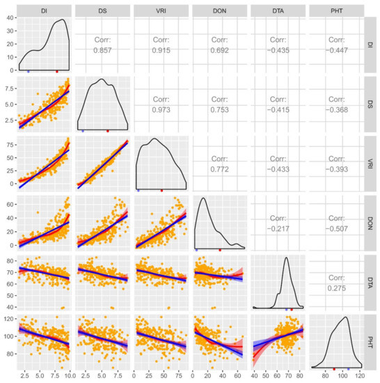 A correlation analysis demonstrated positive relationships among DI, DS, VRI and DON, and between DTA and PHT, but a negative relationship between FHB related traits/variables and agronomic traits (DTA and PHT; Figure 1). Regression line analysis showed moderate to high contributions of DI and DS to DON accumulation (Figure 1), indicating the usefulness of DI and DS data for determining FHB resistance and DON accumulation.