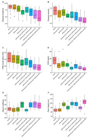 Boxplot distributions of doubled haploid (DH) population produced from the cross AAC Innova x AAC Tenacious. Effects of positive alleles of single QTL (QFhb.lrdc-2D.1, QFhb.lrdc-2D.2 and QFhb.lrdc-4B) and their combinations on average Fusarium head blight incidence (A), severity (B), visual rating index (C), deoxynivalenol (DON) accumulation (D), days to anthesis (E) and plant height (F) are depicted alongside negative alleles at all three loci using pooled phenotypic data (average of all environments). Quartiles and medians are represented by boxes and continuous lines, respectively. Whiskers extend to the farthest points that are not outliers, whilst outliers are shown as black dots.