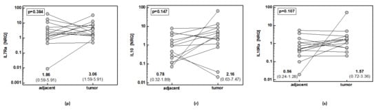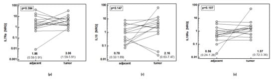 Pairwise analysis of local expression of cancer-promoting mediators in esophageal mucosa: (a) Ki67; (b) BCL2; (c) BCLxL; (d) CDKN1A; (e) NOS2; (f) ODC1; (g) SLC2A1; (h) HIF1A; (i) VEGFA; (j) CCL2; (k) PTGS2; (l) ACTA2; (m) TJP1; (n) CLDN2; (o) IL7; (p) IL7Ra; (r) IL10; (s) IL10Ra. Data were analyzed as logs using t-test for paired samples and presented as geometric means of normalized relative quantities (NRQ) with 95% confidence interval (CI).