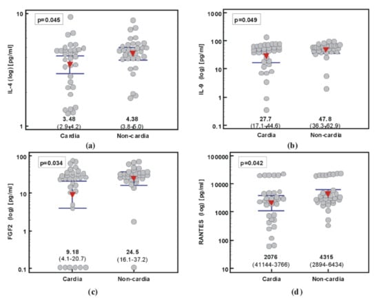 Systemic concentration of cytokines, chemokines, and growth factors in cardia and non-cardia subtypes of gastric cancer: (a) IL-4; (b) IL-9; (c) FGF2; (d) RANTES. Data presented as means (red triangles) with 95% confidence interval (whiskers) and analyzed using t-test for independent samples with Welch correction.