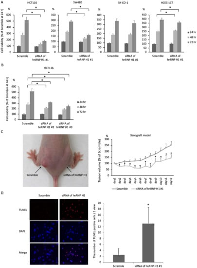 Heterogeneous nuclear ribonucleoprotein H1 (hnRNP H1) promoted cell progression by inhibiting apoptosis in colorectal cancer cells. (A) The sulforhodamine B (SRB) assay (n = 5) showed that cell growth was significantly reduced in HCT116 and SW480 cells transfected with an siRNA of hnRNP H1 compared with those transfected with scrambled RNA. The SRB assay (n = 5) showed that cell growth was suppressed to a lesser degree or not at all by the downregulation of hnRNP H1 in HCEC-1CT or SK-CO-1 cells. (B) The SRB assay (n = 5) showed that cell growth was significantly reduced in HCT116 cells transfected with siRNAs of hnRNP H1 #2 and #3 compared with cells transfected with scrambled RNA. (C) HCT116 cells were transplanted into nude mice, and the siRNA of hnRNP H1 #1 or scrambled RNA was injected daily. Tumor growth was significantly reduced by treatment with the siRNA of hnRNP H1 #1. (D) The number of terminal deoxynucleotidyl transferase dUTP nick-end labeling (TUNEL)-positive cells was significantly higher in HCT116 cells transfected with the siRNA of hnRNP H1 #1 than in those transfected with scrambled RNA. The error bars show the standard deviation (SD). * p < 0.05 by Student’s t-test.