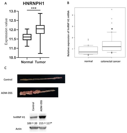 hnRNP H1 was highly induced in colorectal cancer cells. (A) An analysis using the UCSC Xena system revealed the overexpression of hnRNP H1 in colorectal cancer tissues (n = 286) compared with normal colon tissues (n = 41). (B) RT-PCR revealed the overexpression of hnRNP H1 mRNA in surgically removed specimens of human cancerous lesions (n = 32) compared with non-tumorous lesions (n = 28). (C) Western blotting showed the overexpression of hnRNP H1 in the colon of azoxymethane (AOM)/dextran sodium sulfate (DSS) carcinogenesis model mice compared with control mice. *** p < 0.0001, * p < 0.05 by Student’s t-test.