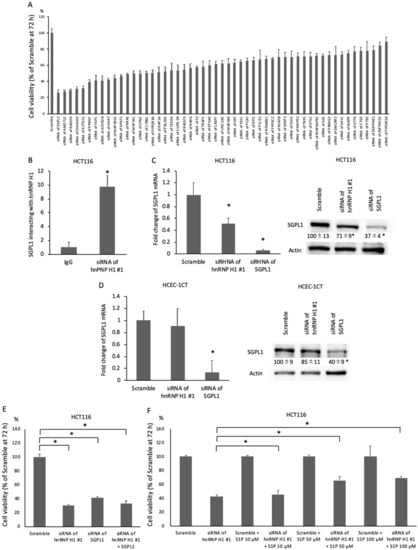 hnRNP H1 upregulated sphingosine-1-phosphate lyase 1 (SGPL1) mRNA and promoted colorectal cancer progression. (A) The SRB assay (n = 5) showed that SGPL1 downregulation resulted in the strongest inhibition of cell growth in HCT116 cells. (B) RNA immunoprecipitation combined with RT-PCR (n = 3) confirmed the direct binding of hnRNP H1 and SGPL1 mRNA. (C) RT-PCR (n = 3) and western blotting (n = 3) showed the decrease in SGPL1 mRNA and protein in hnRNP H1-downregulated HCT116 cells. (D) RT-PCR (n = 3) and western blotting (n = 3) showed that the downregulation of SGPL1 mRNA and protein was not observed in hnRNP H1-downregulated HECE-1CT cells. (E) The SRB assay (n = 5) showed that an additional tumor-suppressive effect was not observed by SGPL1 downregulation. (F) The SRB assay (n = 5) showed that cell growth was significantly increased in the hnRNP H1-downregulated HCT116 cells with S1P in a concentration-dependent manner compared to those without sphingosine-1-phosphate (S1P). The error bars show the SD. * p < 0.05 by Student’s t-test.