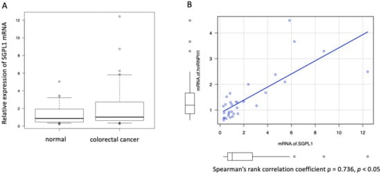 An RT-PCR analysis of the surgically resected samples in our institution showed that SGPL1 mRNA tended to be highly expressed in colorectal cancer tissues (n = 32) compared with normal mucosa tissues (n = 28) (p-Value = 0.10, Figure 4A). Spearman’s rank correlation coefficient revealed strong positive correlation (ρ = 0.736, p-Value < 0.05) between hnRNP H1 mRNA and SGPL1 mRNA (Figure 4B).