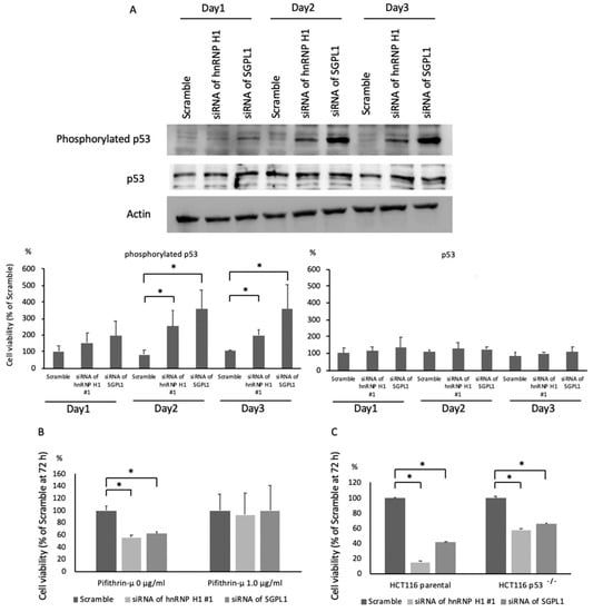 siRNA of hnRNP H1 or SGPL1 upregulated p53 phosphorylation and inhibited cell growth. (A) Western blotting (n = 3) revealed that phosphorylated p53 was significantly increased in hnRNP H1- and SGPL1-downregulated cells, whereas p53 did not change. (B) The SRB assay (n = 5) revealed that the tumor-suppressive effect induced by downregulating hnRNP H1 or SGPL1 after 72 h in cultured HCT116 cells was diminished by treatment with the p53 inhibitor, pifithrin-μ. (C) The SRB assay (n = 5) revealed that the tumor-suppressive effect induced by downregulating hnRNP H1 or SGPL1 was less influential in HCT116 p53−/− cells than in HCT116 parental cells (C). The error bars show the SD. * p < 0.05 by Student’s t-test.