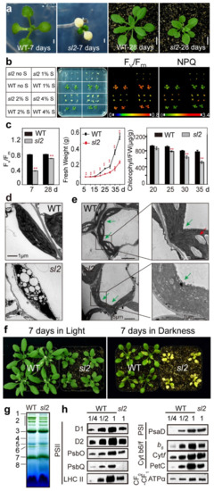 Phenotypic characterization of the sl2 mutant. (a) Seedlings of the wild-type (WT) and sl2 grown on ½ MS medium containing 1% sucrose for seven days (left, bar = 1 mm) and in soil for 28 days (right, bar = 1 cm); (b) Chlorophyll fluorescence images of the WT and sl2 seedlings grown on ½ MS medium without or with 1%, 2%, and 4% sucrose. The false-color images ranging from black (0) to red (1) represent Fv/Fm, and green (0) to red (3.4) represent nonphotochemical quenching (NPQ); (c) The chlorophyll fluorescence (left), fresh weight (middle), and chlorophyll contents (right) of WT and sl2 plants grown in soil. Fv/Fm, the maximum efficiency of PSII photochemistry. Data shown as mean ± SE (n = 8 for chlorophyll fluorescence, n = 12 for fresh weight, and n = 8 for chlorophyll content). Three independent experiments were performed with three biological replicates. The three biological replicates showed similar results, and one of them is shown in this figure. Asterisks show significant difference from the WT plants at ** p < 0.01 (Student’s t test); (d) Transmission electron micrograph of chloroplasts from cotyledons of seven-day-old WT and sl2 seedlings grown on ½ MS medium containing 1% sucrose; (e) Transmission electron micrograph of chloroplasts from true leaves of three-week-old WT and sl2 seedlings. Red arrows indicate starch grains; green arrows indicate chloroplast division sites; (f) WT and sl2 seedlings grown in soil under normal growth conditions (16 h light/8 h dark, 80 μmol·m−2·s−1) for three weeks, and then cultured under normal growth conditions (left), or in darkness (right) for another week; (g) Blue native polyacrylamide gel analysis of five-week-old WT and sl2 mutant plants (20 wild-type plants and 40 sl2 mutants were used in this experiment). Annotation of the different complexes: 1, NDH-PSI; 2, PSII super complexes; 3, PSI monomer, PSII dimer, and PSII monomer with LHCII trimer; 4, PSI monomer and CF1 complex; 5, PSII monomer; 6, LHCII assembly; 7, LHCII trimer; 8, LHCII monomer; (h) Analysis of thylakoid membrane protein accumulation in the five-week-old WT and sl2 mutant plants (about 20 wild-type plants and 40 sl2 mutants were involved in this experiment). 4 μg chlorophyll of thylakoid proteins were separated by 12% SDS PAGE and immunoblots were performed using antibodies as indicated.