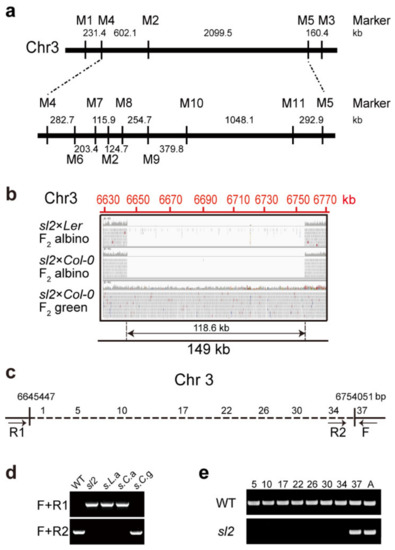 To illustrate the genetic characteristics of the gene(s) controlling chloroplast development, the relevant gene(s) in sl2 mutants were isolated by map-based cloning combined with bulked segregant analysis. A mapping population was generated by crossing the sl2 mutants (with Col-0 background) with Ler (Landsberg erecta). Using simple sequence length polymorphism (SSLP) markers [34] (Supplementary Table S2), SL2 was located between the M10 and M11 markers on chromosome 3 (Figure 2a). Bulked segregant analysis was used for fine mapping [35]. The sequencing results showed that there was a 118.6 kb deletion in the region between the M10 and M11 markers in sl2 mutants (Figure 2b). To confirm the deletion, three primers were designed (Figure 2c), and the PCR results showed that plants with albino cotyledon all had the deletion in the region (Figure 2d). The 118.6 kb deletion sequence contained 37 genes (Figure 2c, Supplementary Table S1) whose transcripts were not detected in the sl2 mutants (Figure 2e). This indicates that the phenotype of the sl2 mutant may be caused by the deletion of these genes.