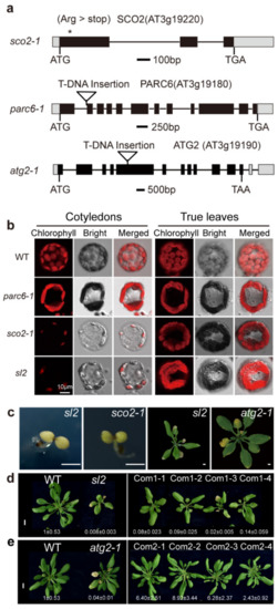 Within the deletion region, 23 of the 37 annotated genes encoded unknown proteins, and the remaining 14 genes had been previously characterized (Supplementary Table S1). At3g19220, encoding snowy cotyledon 2 (SCO2), regulates cotyledon chloroplast development, and its loss-of-function mutant shows an albino cotyledon phenotype. However, true leaves of sco2 have a normal green appearance [36,37,38]. AT3g19180, encoding the paralog of accumulation and replication of chloroplast 6 (PACR6), regulates chloroplast division, and its loss-of-function mutant shows abnormal chloroplast division [39,40]. AT3g19190, encoding autophagy-related 2 (ATG2), regulates the early steps of autophagosome biogenesis, and its loss-of-function mutant shows autophagy defects [26,41]. Furthermore, we obtained Transfer DNA (T-DNA) insertion mutants (sco2-1, CS68145; parc6-1, SALK_100009C; and atg2-1, SALK_076727) (Figure 3a). The sco2-1 mutants exhibited pale cotyledon but normal green true leaves (Figure 3b,c). Compared with the WT plants, the parc6-1 mutants showed abnormalities in the size and shape of chloroplasts in mesophyll cells (Figure 3b). In particular, the phenotypes including pale cotyledon and larger chloroplasts in true leaves observed in sl2 mutants might be due to the absence of SCO2 and PARC6, respectively (Figure 3b). In addition, the chlorophyll degradation in sl2 mutants might result from ATG2 deficiency (Figure 3c). To investigate this possibility, we introduced homozygous sl2 and atg2-1 mutants with full-length ATG2 cDNA driven by the cauliflower mosaic virus 35S promoter (sl2/35S::ATG2 and atg2-1/35S::ATG2). T2 generation seedlings of four independent transgenic lines were analyzed. The degreening phenotypes of sl2 and atg2-1 were complemented by ATG2 in the transgenic plants (Figure 3d,e).