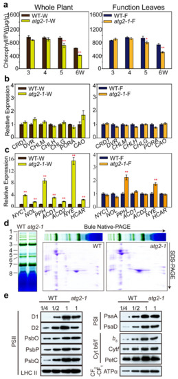 Lack of ATG2 accelerated degradation of chlorophyll and thylakoid proteins. (a) The chlorophyll contents of whole plants (left) and functional leaves (right) of WT and atg2-1 mutant plants grown for three to six weeks in soil. Values are mean ± SE (n = 6 plants). Asterisks show significant difference from the WT plants at * p < 0.05 and ** p < 0.01 (Student’s t test); (b) Expression levels of chlorophyll synthesis-related marker genes measured by quantitative RT-PCR in whole plants and functional leaves; (c) Expression levels of chlorophyll degradation-related marker genes measured by quantitative RT-PCR in whole plants and functional leaves. The results are shown as mean ± SE from three experiments. Asterisks show significant difference from the WT plants at ** p < 0.01 (Student’s t test); (d) Blue native polyacrylamide gel and the subsequent second dimension SDS-PAGE analysis of thylakoid proteins from five-week-old WT and atg2-1 mutant plants (10 wild-type plants and 10 atg2-1 plants were used in this experiment). Annotation of the different complexes: 1, NDH-PSI; 2, PSII super complexes; 3, PSI monomer, PSII dimer and PSII monomer with LHCII trimers; 4, PSI monomer and CF1 complex; 5, PSII monomer; 6, LHCII assembly; 7, LHCII trimers; 8, LHCII monomers; (e) Analysis of thylakoid membrane proteins accumulation in the five-week-old WT and atg2-1 mutant plants.